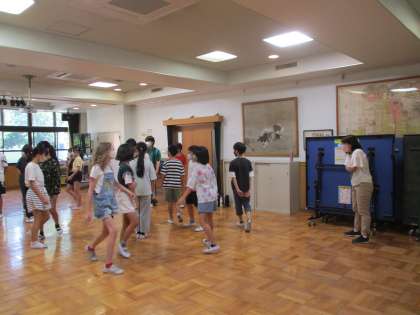 2組では、リーダー役の子の動きに合わせて、動いたり、歩いたりして、鬼役が、だれがリーダーか見つけるゲームをしていました。リーダーの動きを横目で見ながら、みんなが動きを合わせることでリーダーを見つけることが難しくなり、当てられないこともありました。