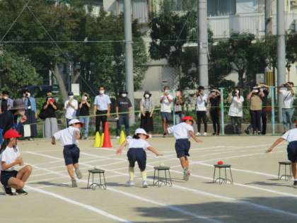 初めの競技は、1年生によるアイデア走。ミニハードルを跳び越し、フープをくぐって、最後は赤白玉を台の上に置いてゴールまで駆け抜けます。