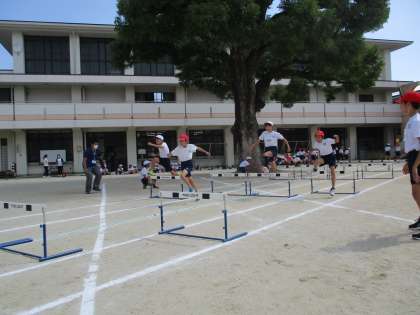 最後の個人種目は5年生のハードル走。体育の時間に自分のインターバルを確認し、リズムよく跳び越せるように練習していました。