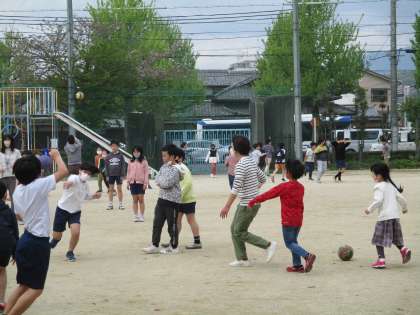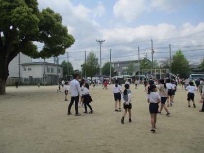 中間休みになると、たくさんの子どもたちが担任の先生と一緒に運動場に出てきて遊んでいました。