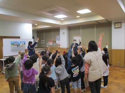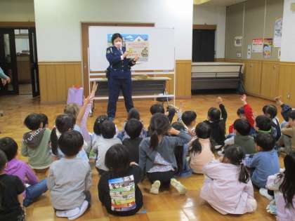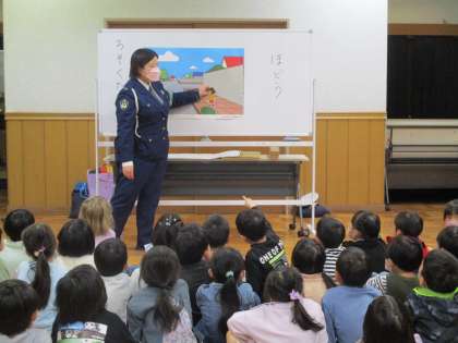 今日は、北警察署から警察官の方2名と地域交通安全活動推進委員の方4名に来ていただき、交通安全教室を行っていただきました。