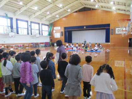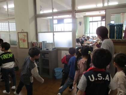 学校に来て今日で4日目。今日は、衣笠小学校にはどんなお部屋があるのか、1年生みんなで学校探検をしました。