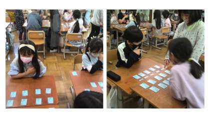 百人一首は、上の句と下の句を覚えて相手よりも素早く札をとる楽しみがあります。子どもたちは、楽しみながら札を取合い、読み上げる声をしっかり聴けるよう、静かに聞く姿が見られました。