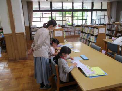 図書館では、さっそく机の上に宿題のドリルやプリントを出して、取り組んでいました。困っていると、まなびのスタッフの方が声をかけてくれるので、子どもたちもわからないことはスタッフの方に聞いて、がんばっていました。