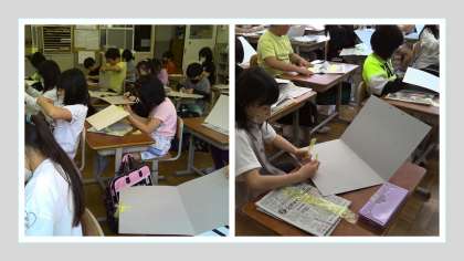毛筆の学習で使う「紙ばさみ」を作りました。厚紙を二つに折り、ひもをつけて作りました。ひもを通すのが難しかったのですが、一生懸命作る姿が見られました。