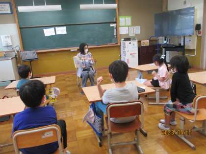 毎木曜日の朝学習の時間に司書の中野先生が読み聞かせに来てくださいます。「おれはワニだぞ」の本でした。ワニがいろいろと考える楽しいお話にみんな次はどうなるかどきどきしながら見ていました。さあ、来週はどんなお話かな。楽しみです。