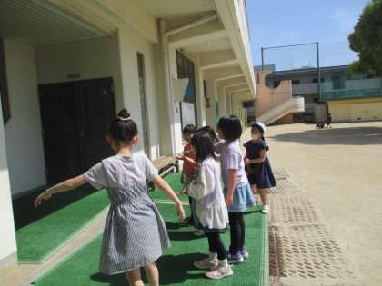 今日も良いお天気で、お昼から気温も上がってきていたので、暑さ対策として、ミストシャワーをつけました。すると、遊んでいた子たちがさっそく涼みに来て「冷た〜い」と気持ちよさそうにしていました。