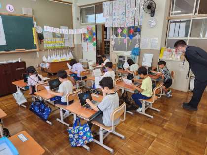 今日は、1年生が初めてGIGA端末を使う練習をしました。