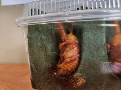 先週、地域の方からいただいた“ようちゅう”が、今日の午前中に最後の脱皮をして、“さなぎ”に姿を変えていました。