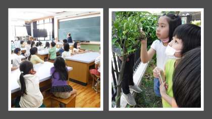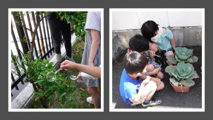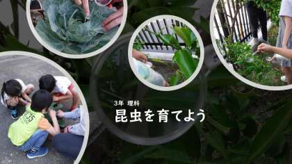 3年理科の学習で、学校にあるキャベツやかんきつの木についている昆虫の幼虫を見つけました。どの子も目を輝かせて昆虫を探すことができました。