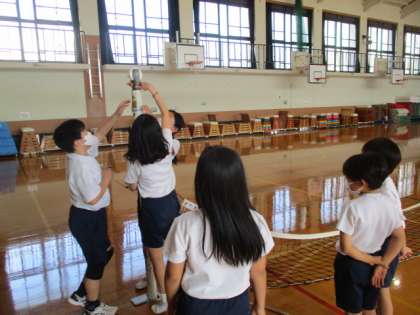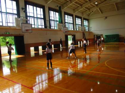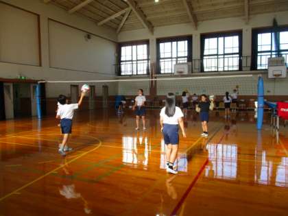 その後、準備体操をしてから、二人組でパスやレシーブの練習を行いました。最後に、サーブの練習もしましたが、初めての4年生もネットを越して喜んでいる姿がありました。
