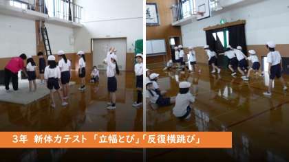3年生「体力テスト」を実施しました。2年生で体験した「立ち幅跳び」と「反復横跳び」を行いました。競技の説明を聞いているときには、不安そうだった子も練習して本番を迎える頃には、1回目の記録より良い記録を出そうと頑張る姿が見られました。