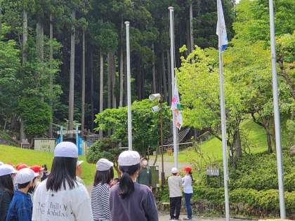 校歌を歌いながら、みんなでつくった校旗を掲げました。