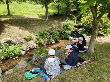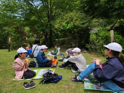 自然の中で食べるお弁当、子どもたちは嬉しそうです。