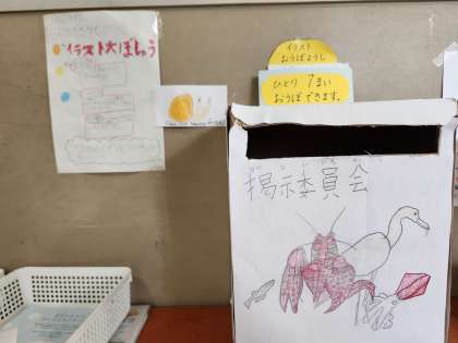 掲示委員会が募集していたカタツムリのイラストがたくさん集まり、体育館に行く廊下の掲示板に貼りだされました。