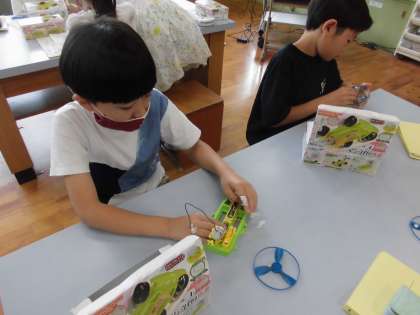 モーターを速く回したり,豆電球を明るくするためにはどうすればよいのか。ということを調べました。「電池を増やせばいいと思う!」という意見が子どもたちから出ました。色々なつなぎ方を班で考えてから,実験をしました。2個に増やすだけではなく,つなぎ方も関係していることが分かったようです。回路を作るのに苦労する場面もありましたが,班で協力してがんばっていました。直列つなぎ,へい列つなぎという名前を聞くと,なんだか嬉しそうな4年生たちでした。