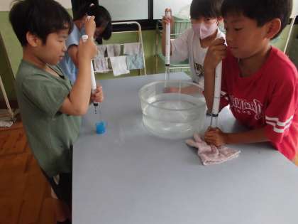空気の体積はとても小さくなりましたが,水はどうなるだろうか?ペットボトルに入れた水を触ったことを思い出して,「水はかたそう!」と予想をした子どもたち。予想通り,押し棒は全然下がりませんでした。「めちゃくちゃ固い!!」「全然下がらない!!」と予想通りではあったものの,驚きながら実験をしていました。