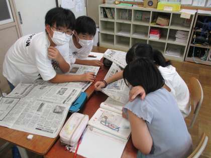 今日は、新聞の構成を確認したり、1面を見て気付いたことを交流したりしました。