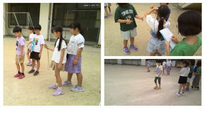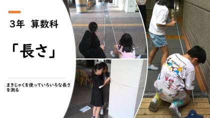 算数科「長さ」の学習で、巻尺を使って、長さを測る活動を行いました。教室のたてと横の長さ・校庭の木の周りの長さ・いろいろなところの長さを予想してから測ることで、巻尺は長いものや丸いものの長さを測るときに用いるとよいことを、実感を伴って計測する姿が見られました。また、100mの道のりを歩いてかかった時間を基に、いろいろな道のりの長さを予想して調べる活動を通して、時間と道のりの関係に興味をもち、およその道のりを求める方法について具体的なイメージをもって考える姿が見られました。