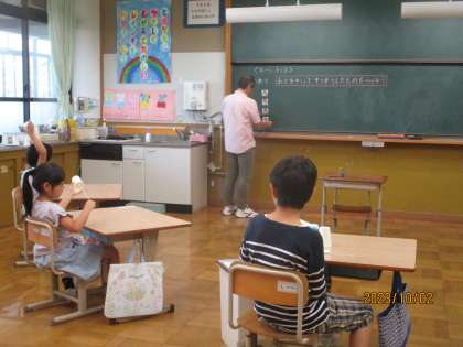 5人で学習する時間が増えています。図工も始まりました。「ホーントット」と言って紙コップ・タコ糸・竹ひごを使って作ります。不思議な音が出るのです。今日は音を聞いて浮かんだ動物や物を考えて絵に描きました。出来上がりが楽しみです。