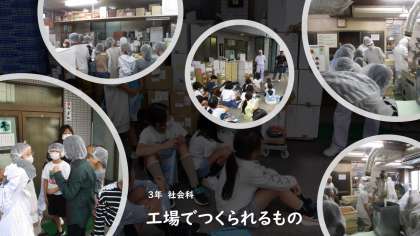 3年社会科の学習で、「工場でつくられるもの」の学習をしています。そこで、工場の仕事について、仕事の種類や産地の分布、仕事の工程などに着目して、見学・調査、資料で調べることをします。また、生産に携わっている人々の仕事の様子を捉えたり、人々の生活との関連を考えたりします今回は、「関製菓本舗」の工場見学に行き、お菓子作りや実際に販売されるまでの工程を教えていただきました。