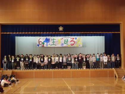 児童会より「6年生を送る会」が行われました。歌を送ったり学校クイズの他に,6年生に好きな給食や思い出に残った行事や将来の夢をインタビューしました。6年生に心のこもった手作りのペンダントを渡し,6年生からは手縫いの雑巾を各クラスにいただきました。
