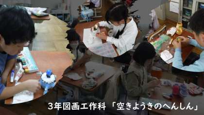 3年図画工作科「空きようき」のへんしん」の学習で、身近な空き容器を使って、小物入れをつくりました。どのようなものを入れたいか、どこで使いたいかなどを想像しながらつくる姿が見られました。出来上がった作品をおうちで使うのが楽しみですね。