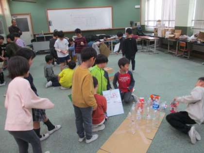 身の回りにあるペットボトルや段ボール、お菓子の箱などを使って、転がしたり、投げたり、飛ばしたりして遊ぶおもちゃを作り、1年生や6年生を招待して遊んでもらう計画をしています。