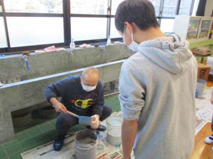 最初は先生と一緒に全体的に釉薬につけ、その後、自分で細かいところを仕上げていきます。