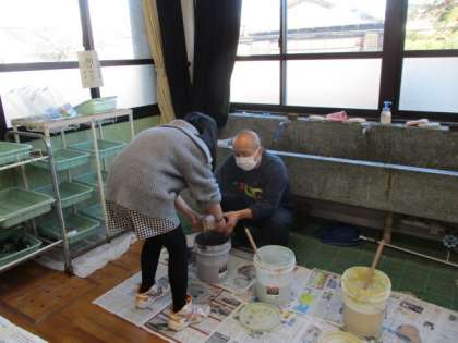 今日は2回目ということで、年末に作成し、窯で焼いていた作品に釉薬を使って色を付ける作業をしました。