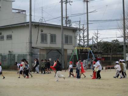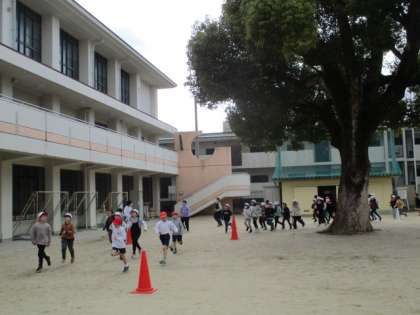 中間休みに全校のみんなが運動場に出てきて、約8分間走ります。
