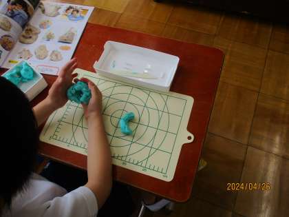 粘土をにぎにぎした感触を味わいました。にぎにぎの感触を楽しみながら、作る作品を考えました。にぎにぎしている間に「化石みたい。」「魚にしよう。」などたくさん作りたいものを発表していました。