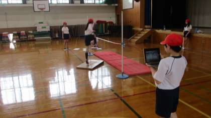 とび箱の1段目を使って空中動作の練習をしたり、GIGA端末を使って自分のとび方を確認したりしています。