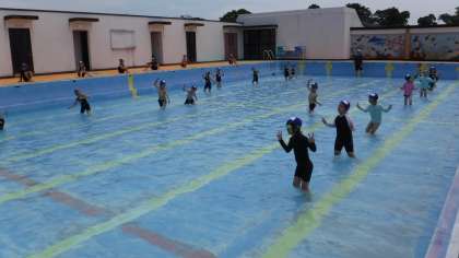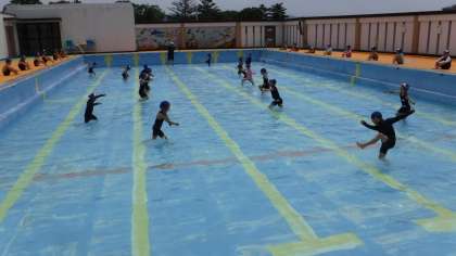1年生にとって今日は2度目のプール遊びでした。お天気も良く、水がとても気持ちよかったです。プールの中を大きく1歩1歩進んだり、カニさんになって横向きに進んだり、ペンギンになってとことこ歩いて進んだりしました。最後に自分の顔や身体に水をじゃぶじゃぶしました。「楽しかったー。」「もっとやりたい!」と笑顔いっぱいの子ども達でした。