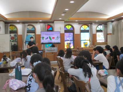 今年度初めてのランチルーム給食がありました。初めに,栄養教諭の竹中先生から,夏を元気に過ごすために気をつけることについて,食の観点から教えていただきました。配膳もテキパキと行い,5年生みんなで楽しく給食をいただくことができました。