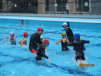 7月5日金曜日 大将軍小学校へ交流に行きました。歩いて行き、とても暑かったですが、頑張りました。大将軍小学校のプールは、青の色でとてもきれいでした。一緒におにごっこをしたり、走る競争をしたりと広いプールで思い切り楽しみました。今度は、衣笠小学校へ来てもらいます。