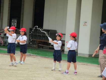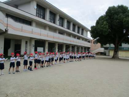 生活科「なつとともだち」〜みずであそぼう〜の学習で、水を使って遊びました。1年生全員で一列になって水とばしをしました。みんな遠くまで水を飛ばすことができました。その後は、地面に絵をかいたり、砂場に水をためて遊んだりしました。水を遠くに飛ばすために、また水を多く運ぶために、容器を比べて選んでいました。