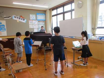 鍵盤ハーモニカ、木琴、リコーダーと井上先生のピアノに合わせて合奏をしました。みんなとても上手になり、井上先生からも「上手になっていて、びっくりしました。」と褒めていただきました。その後は、新しい曲の練習もしていただきました。2学期も頑張って練習していきます。