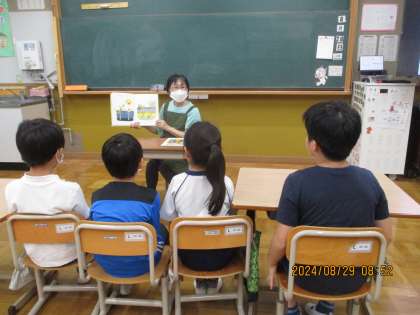 2学期最初の読み聞かせがありました。中野先生の楽しい読み聞かせは、みんなが楽しみにしています。今日は、ドラゴンが出てくるお話でした。感想もそれぞれ違い、「ああ、そういう感想もいいな。」と友達と一緒に聞くよさにも気付けるようになってきました。いろいろな内容の本に親しんでほしいです。