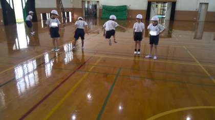 2学期が始まりました。毎日暑い日が続いていますが、暑い日でも体育の授業を力いっぱい頑張っています。さて、今回の体育は、「とびあそび」です。じゃんけんで勝った子が前に進める「グリコ」の遊びをはじめとし、遠くや上に連続して跳ぶ学習をしました。