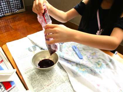 袋に入れた花をよく揉むと鮮やかな色水が出てきました。折った和紙の四隅に色水を吸わせると様々な模様ができ、子どもたちは「きれい!」と喜んでいました。