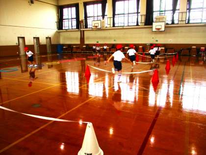 体育科で『とびあそび』の学習を行いました。大縄跳びの縄を川に見立てて、こちらの岸から向こうの岸へ跳んだり、ゴムを跳び越えたり、フラフープの島ををリズムよくジャンプして進んだりと、様々な用具を使った『とびあそび』にチャレンジしました。