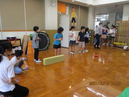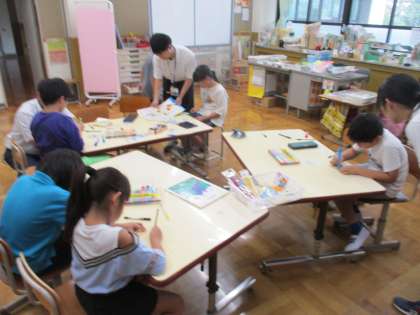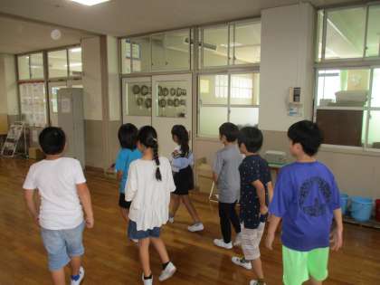9月10日(火)、3、4校時に大将軍小学校3組を迎えて交流しました。最初は、今の自分の自己紹介をしました。それぞれが今、どんなことが好きかわかったのでよかったです。次に衣笠小学校の学校案内をしました。わかば学級のみんなは自分の担当の場所を名前だけでなく何をするところかもわかるように工夫して説明をしていました。大将軍小学校のみんなはプールが屋上にあることに驚いていました。休憩の後、みんなで「ボッチャ」をしました。青チームと赤チームに分かれてミックスチームで対戦しました。順番を決めたり作戦タイムで話し合ったりしてさらに仲良くなれました。ちょうど中間休みの時間でもあったので、衣笠校のみんなが応援に来てくれて盛り上がりました。最後にプラ板づくりをしました。丁寧にプラ板に絵を描き、アクセサリーを作りました。完成した時、みんな嬉しそうでした。あっという間に楽しい時間は過ぎました。また、交流することを約束して交流会は終わりました。次回が楽しみです。