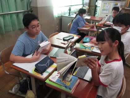 どちらのクラスも様々なテーマから、本を選んでいました。ふり返りでは、「同じテーマでも違うテーマでも、共通点があって、紹介された本を読んでみたくなった。」「友達の考えを聞いて、自分なら...と考えさせられた。」と自分の考えを広げたり深めたりすることができました。以前、学習した「対話のよさ」を意識して取り組めました!