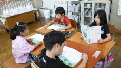 国語科「やくそく」では、3匹の「あおむし」や「大きな木」の様子や気持ちを声で表現しました。登場人物になりきって表現するためには、「誰が言った」「誰が何をした」のかを、読み取る力を身に付けることが必要です。学級全体で話し合い、グループで役割を決めて音読練習をしました。