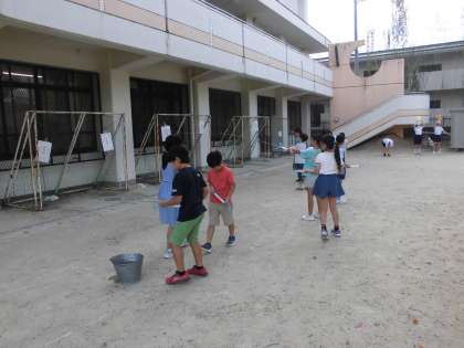 的に向けて飛ばしたり,絵を描いたり,空に打ち上げてみたり・・・。色々な方法を試しながら実験をする子どもたちでした。