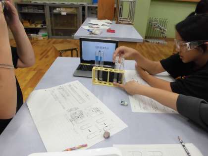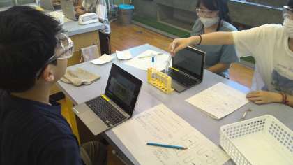 塩酸に鉄やアルミニウムを入れると,金属がどうなるのかを調べました。少し時間がかかりましたが,アルミニウムが激しく反応し始めると,子どもたちは驚き,とても興味深く観察していました。実験後は「今日の実験楽しかった!」という声がたくさん聞こえてきました。