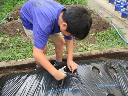平らになった畑の上に防草シートを張りました。風で飛ばないようにまわりをしっかり土で押さえました。その後、ペットボトルで印をつけてはさみで切って種をまくための穴をあけました。シートをはさみで切ることが難しく、しっかり引っ張りながら切っていました。