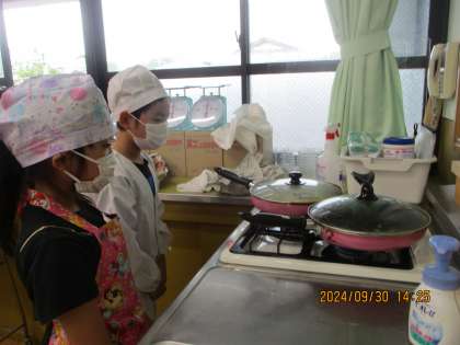 火にかけると、はじけるまで見て待っていました。はじけだすとフライパンの中でポンポン音を鳴らしながらはねているのが楽しいようでした。焦げるといけないので頃合いを見て火を消し、残りは予熱ではじけさせました。安全に気を付けてフライパンを運びお皿に盛り付けました。塩を3回振りかけて塩味にして、みんなで食べました。出来たてはおいしいと喜んで食べていました。サプライズでキャラメル味を大人で作り、みんなで食べました。味の違いを楽しみながら食べていました。たくさん作ったので残りは、職員室の教職員の皆さんに食べてもらうことにしました。自分で作れて楽しかったようです。次は、10月に収穫するサツマイモの調理です。何を作るか、みんなで相談して決めたいと思います。