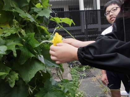 「花から実へ」の学習です。花から実になるためには受粉が必要なのか?条件を整えて実験の計画を立てました。畑に植えたヘチマの花がなかなか咲かなかったのですが,先日からようやくつぼみがたくさんでき始めました。そこで,もうすぐ咲きそうな2つのつぼみに袋をかぶせていたのですが,今日の朝花が咲いていることを子どもたちから教えてもらいました!